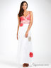 Длинный многоярусный сарафан. Тонкие регулируемые бретельки. V-образный вырез горловины с запахом. Верх спинки посажен на резинку. Застегивается на молнию сбоку. Декорирован нашивками в виде цветов с пайетками.