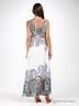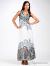 Длинный легкий сарафан прямого покроя. V-образный вырез на полочке и спинке. Под грудью сарафан посажен на резинку. В комплект входят деревянные бусы с золотистой цепочкой.
