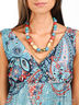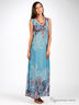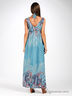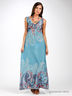 Длинный легкий сарафан прямого покроя. V-образный вырез на полочке и спинке. Под грудью сарафан посажен на резинку. В комплект входят деревянные бусы с золотистой цепочкой.