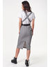 • Особенности: Сарафан прилегающего силуэта. Детали: V-образный вырез, рельефы, перекрестные бретели, съемный пояс с металлической пряжкой.