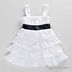 Расклешенная модель на лямках застегивается на скрытую молнию в левом боковом шве. Изделие украшено множеством прозрачных оборок и рюшами. Лиф декорирован контрастной лентой и узором из страз. Лента завязывается на спинке в бант.