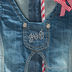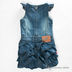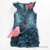 Модель прямого кроя застегивается на скрытую молнию на спинке. Рукава-крылышки. К поясу пришиты шлевки. Множество оборок на юбке. Декоративный вырез на верхней части сарафана. Один нагрудный карман. Декоративные бантики на лямке.