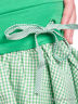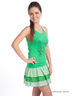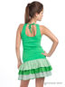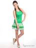 Облегающий верх совмещен с клешеной юбкой, что создает эффект двух отдельных вещей: майки и юбки. Вырез на спинке, завязка на шее. Аппликация и декоративные элементы на полочке. Юбка с множеством оборок.