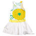 Яркий расклешенный сарафан. Линия талии подчеркнута резинкой.