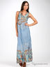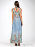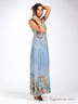 Длинный легкий сарафан прямого покроя. V-образный вырез на полочке и спинке. Под грудью сарафан посажен на резинку. В комплект входят деревянные бусы с золотистой цепочкой.