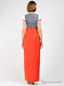 Детали: V-образный вырез горловины, короткие рукава крылышки, оригинальный пристроченный жилет, длинная отрезная юбка, застежка на молнию сзади, полочка декорирована пуговицами.