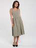 Стильный сарафан выполнен из тонкой костюмной ткани. Клешеная юбка присборена по линии талии, с карманами в боковых швах. Застежка молния расположена с среднем шве спинки. Лямки на пуговицах, что легко позволяет регулировать их длину.