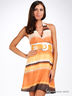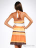 Легкое шелковистое платье с расклешенной юбкой. Отрезной лиф с V-образным вырезом на атласной подкладке. Лямки завязываются на шее. Верх спинки посажен на резинку. Застегивается на молнию сбоку. Трикотажная подкладка. В комплект входит широкий пояс-резинка с кожаными вставками.