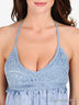 Детали: отрезной лиф на резинке; чашки с поролоновым уплотнителем; бретели завязываются через шею; декорирован принтом и оригинальной вязкой на лифе; низ изделия дополнен воланом