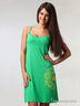 Слегка приталенный сарафан на бретелях, на спинке округлый вырез, изделие декорировано набивным принтом.