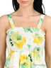 Детали: на регулируемых отстегивающихся лямках с пуговицами, широкая присборенная резинка, отрезная расклешенная юбка, яркий принт
