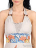 Детали: бретель через шею на завязке, отрезной лиф с поролоновыми чашками, спереди присборено на тонкие резинки, сбоку застегивается на молнию, сзади присборено на резинку