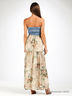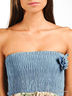 Сарафан без бретелек из легкого лоснящегося материала. Лиф - многорядная резинка, декорирован цветком из джинсы. Под грудью кулиска. Эластичная подкладка.