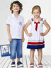 Сарафан для девочки, выполнен из хлопка белого цвета в мелкую серебристую точку. Оригинальный крой рукава. Подол украшен тремя полосками синей, красной и серой, на лямках так же красная и синяя полоска. Изделие декорировано красным бантом.