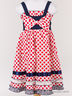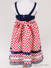 Яркий, контрастный сарафан на бретелях. Сарафан выполнен из контрастных фрагментов ткани. Низ подола украшен оборками и лентами. Застежка сзади на молнию.