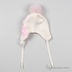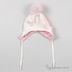 Полушерстяная обтягивающая шапочка с ушками и завязками украшена меховым помпоном и пришитыми декоративными элементами. Хлопковый подклад.
