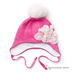 Полушерстяная обтягивающая шапочка с ушками и завязками украшена меховым помпоном и пришитыми декоративными элементами.