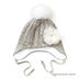 Полушерстяная обтягивающая шапочка с ушками и завязками украшена меховым помпоном и декоративным элементом.
