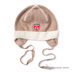 Обтягивающая шапочка с ушками и завязками украшена нашивкой.