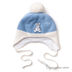 Полушерстяная обтягивающая шапочка с ушками и завязками украшена помпоном и нашивкой.