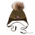 Полушерстяная обтягивающая шапочка с ушками и завязками украшена нашивкой и меховым помпоном.