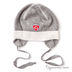 Обтягивающая шапочка с ушками и завязками украшена нашивкой.