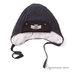 Полушерстяная обтягивающая шапочка с ушками и завязками украшена козырьком-отворотом с нашивкой.