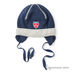 Обтягивающая шапочка с ушками и завязками украшена нашивкой.