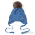 Полушерстяная обтягивающая шапочка с ушками и завязками украшена декоративным отворотом и помпоном.