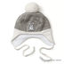 Полушерстяная обтягивающая шапочка с ушками и завязками украшена помпоном и нашивкой.