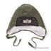 Полушерстяная обтягивающая шапочка с ушками и завязками украшена козырьком-отворотом с нашивкой.