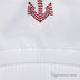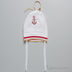 Обтягивающая трикотажная шапочка на завязках украшена контрастными полосками, золотистым бантиком на макушке и декоративными элементами.