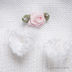 Трикотажная шапочка с оверлоченым отворотом для юной прелестницы. На завязках. Изделие украшено атласной лентой и розочками.