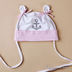 Обтягивающая шапочка с завязками и "ушками" украшена контрастным отворотом и стразами.