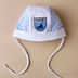 Обтягивающая шапочка с завязками украшена контрастными вставками и нашивкой.