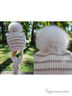 Интересная шапка молочного цвета с бежевыми полосами спереди и белым помпоном из искусственного меха. Изделие дополнено широкими завязками для более комфортной посадки, так же они могут быть использованы в качестве шарфа.