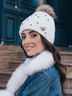 Вязанная шапка с помпоном из натурального енота, полностью утепленная мягкой флисовой подкладкой. Изюминка модели – декор в виде бусин и пришитых «пчёлок».