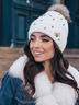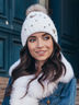 Вязанная шапка с помпоном из натурального енота, полностью утепленная мягкой флисовой подкладкой. Изюминка модели – декор в виде бусин и пришитых «пчёлок».