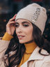 Стильная двойная шапка-бини с добавлением люрексовой нити, декорированная аппликацией с камнями в тон изделия.