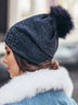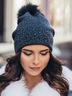 Зимняя шапка с бубоном из натурального енота, декорирована россыпью страз. Внутри в области лба и ушей утеплена флисом (ширина подкладки - 14 см). В основе изделия мелкая вязка.