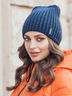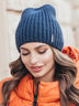 Вязаная шапка-колпак с фурнитурой сбоку. В области лба модель утеплена флисовой полоской. Цвет изделия тёмно-синий.