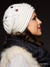 Модная шапка фигурной вязки с добавлением ангоры украшена декоративными элементами. Будьте стильной и женственной.