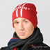 Данная модель представлена трикотажной шапкой из ткани красного цвета с содержанием шерсти. Вязка выполнена тонкой резинкой в два слоя. Спереди принт контрастного белого цвета. Универсальный размер.
