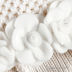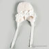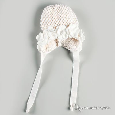 Гладкая шапочка фактурной вязки нежного цвета. С веревочками, украшена декоративными мягкими цветами.