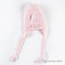 Мягкая шапочка фактурной вязки нежного цвета. С пушистым помпоном, двухслойной вязкой, широкими завязками, украшена бантиком и цветами со стразами.