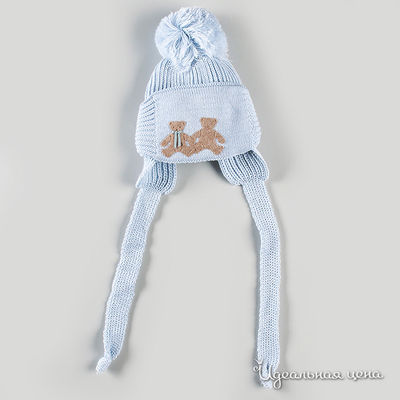 Двухслойная мягкая шапочка фактурной вязки. Небольшой помпон, широкие завязки, украшена нашивками медвежатами.