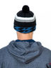 Мужская одинарная шапка оформлена геометрическим рисунком из пряжи нескольких цветов. Помпон на макушке выполнен из ниток основной пряжи. Шапка сбоку украшена фирменной шильдой из кожи.