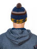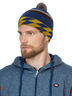 Мужская одинарная шапка оформлена геометрическим рисунком из пряжи нескольких цветов. Помпон на макушке выполнен из ниток основной пряжи. Шапка сбоку украшена фирменной шильдой из кожи.