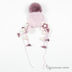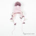 Шерстяная обтягивающая шапочка с ушками и завязками украшена меховым помпоном и пришитыми декоративными элементами. Флисовый подклад.