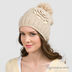 Мягкая и теплая шапка из вязаного полотна декорирована пушистым помпоном, вязаным цветком и ажурной вязкой "косы". Отлично дополнит любой гардероб.